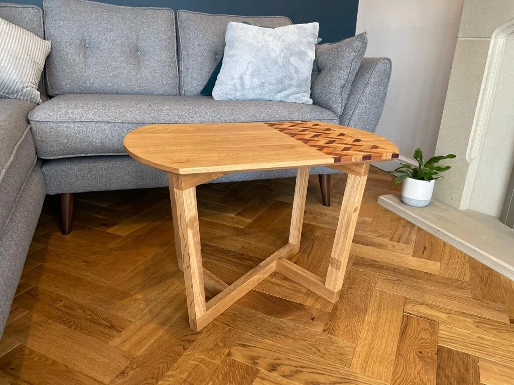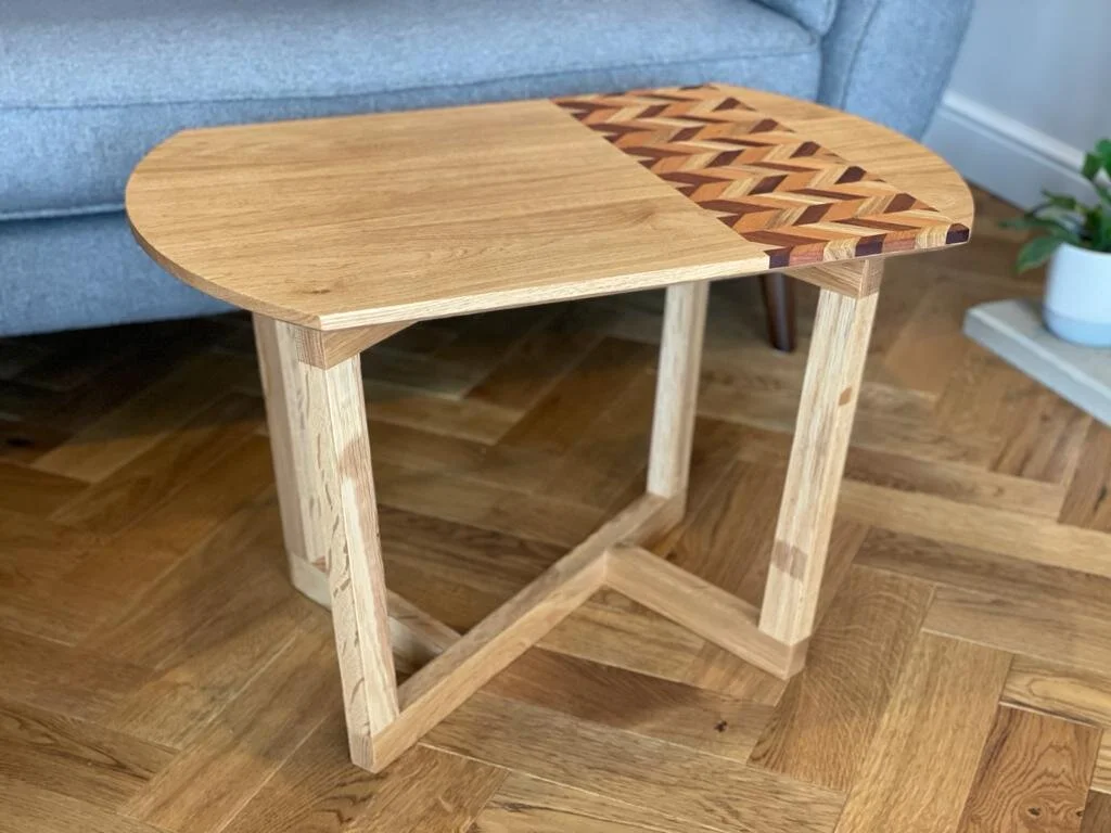 American White Oak, hardwood chevron inlay, off-centre base design with angled legs.
